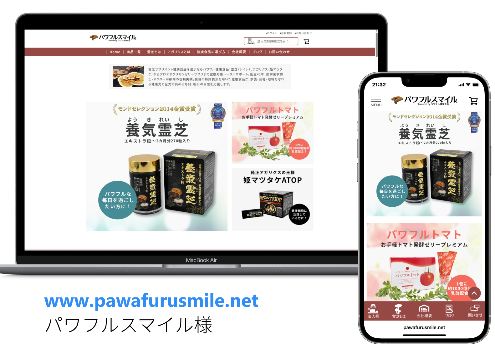 長野県・信濃町。雪深い北信の空気の中で、霊芝(れいし)やアガリクスの研究開発を続ける「パワフル健康食品株式会社」さま。公式ショッピングサイト「パワフルスマイル」のリニューアルをお手伝いしました。